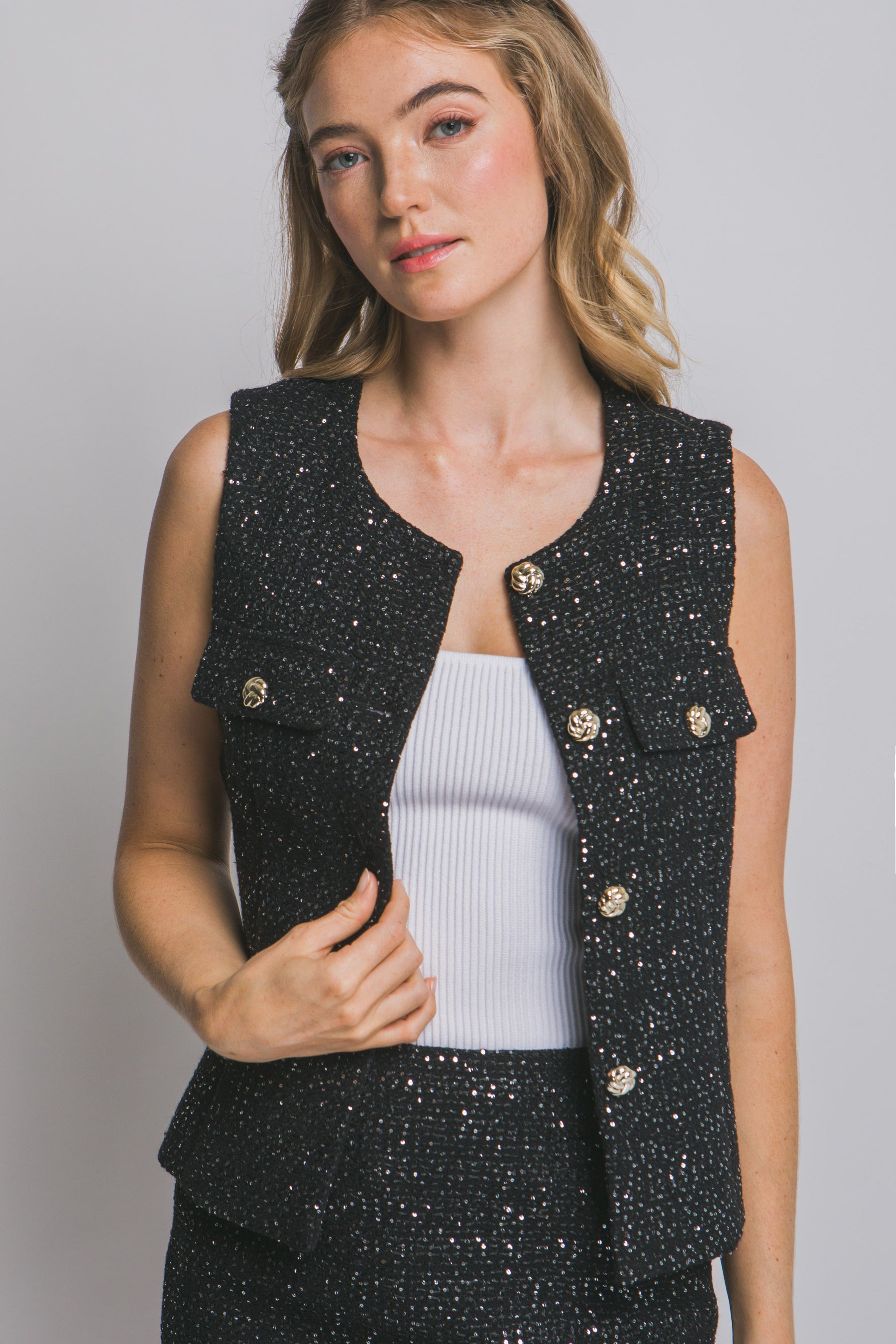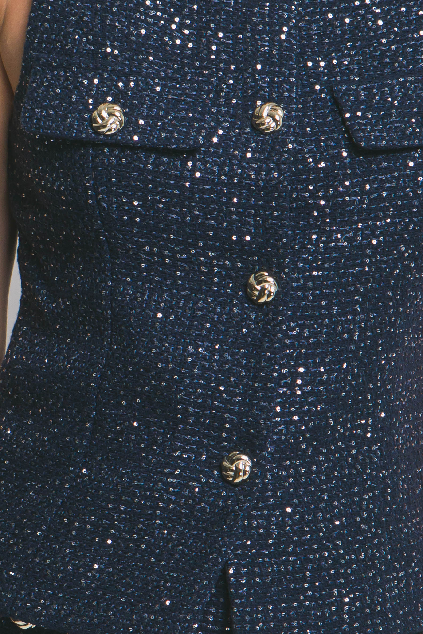 Chaleco con botones dorados, tela con hilos brillosos calidad premium